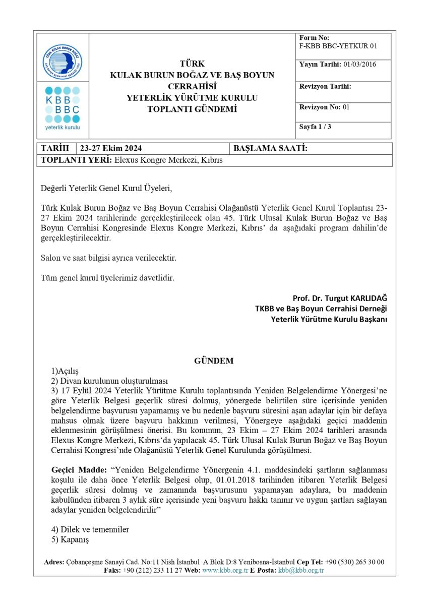 Türk Kulak Burun Boğaz ve Baş Boyun Cerrahisi Olağanüstü Yeterlik Genel Kurul Toplantısı 23-27 Ekim 2024 tarihlerinde gerçekleştirilecek olan 45. Türk Ulusal Kulak Burun Boğaz ve Baş Boyun Cerrahisi Kongresinde Elexus Kongre Merkezi, Kıbrıs‟ da aşağıdaki program dahilin‟de gerçekleştirilecektir.