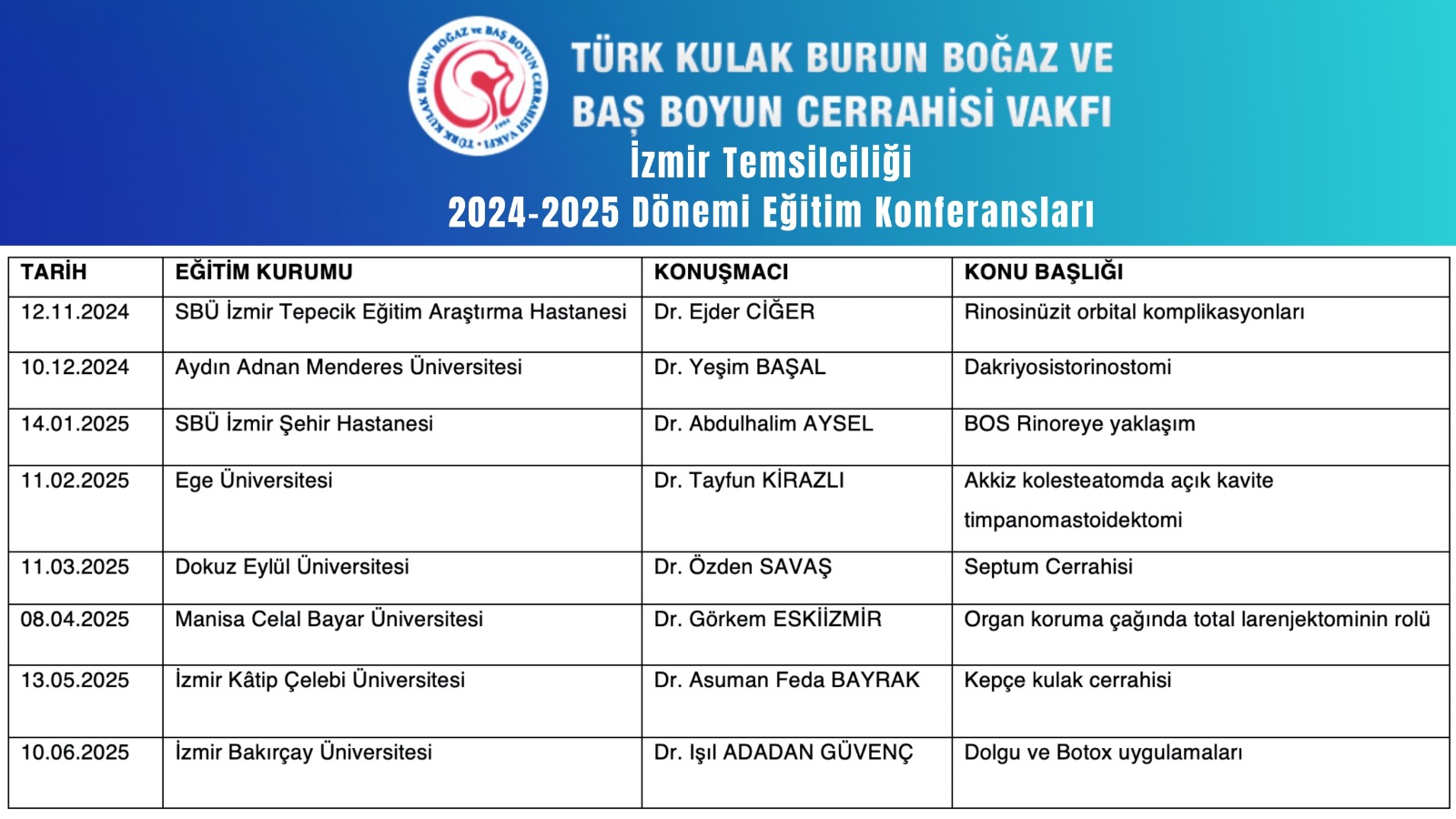 Türk Kulak Burun Boğaz ve Baş Boyun Cerrahisi Vakfı İzmir Temsilciliği yeni dönem eğitim programı belli olmuştur.