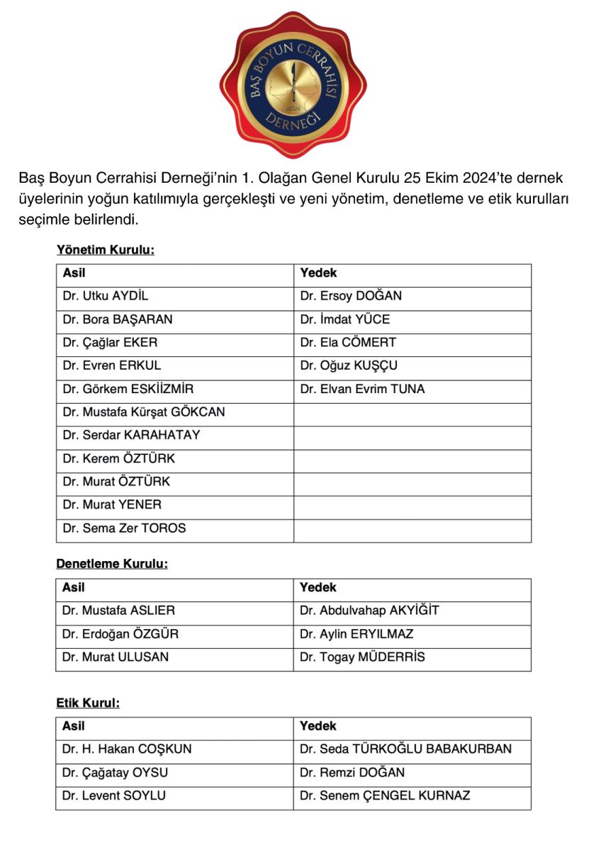 Baş Boyun Cerrahisi Derneği Yeni Yönetim Kurulu
