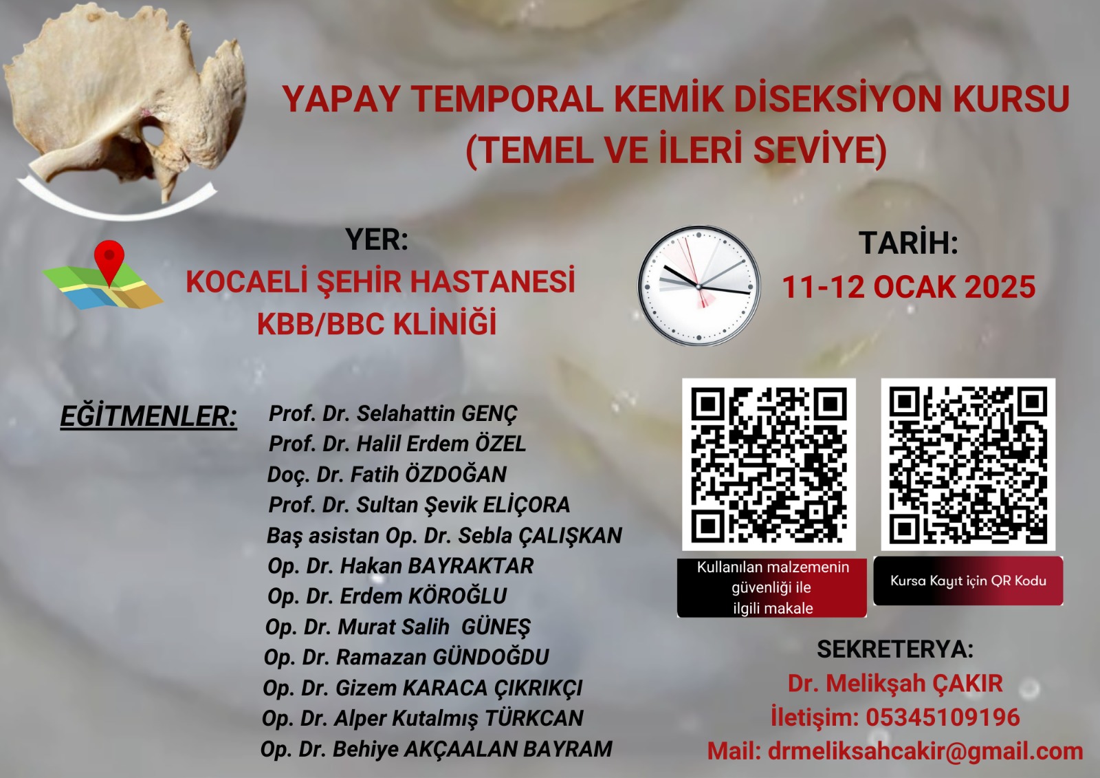 Kocaeli Şehir Hastanesi KBB&BBC kliniğinin düzenleyeceği “Yapay temporal kemik diseksiyon kursu (temel ve ileri seviye)” 11-12 OCAK 2025 tarihinde Kocaeli Şehir Hastanesi KBB&BBC kliniğinde gerçekleştirilecektir.