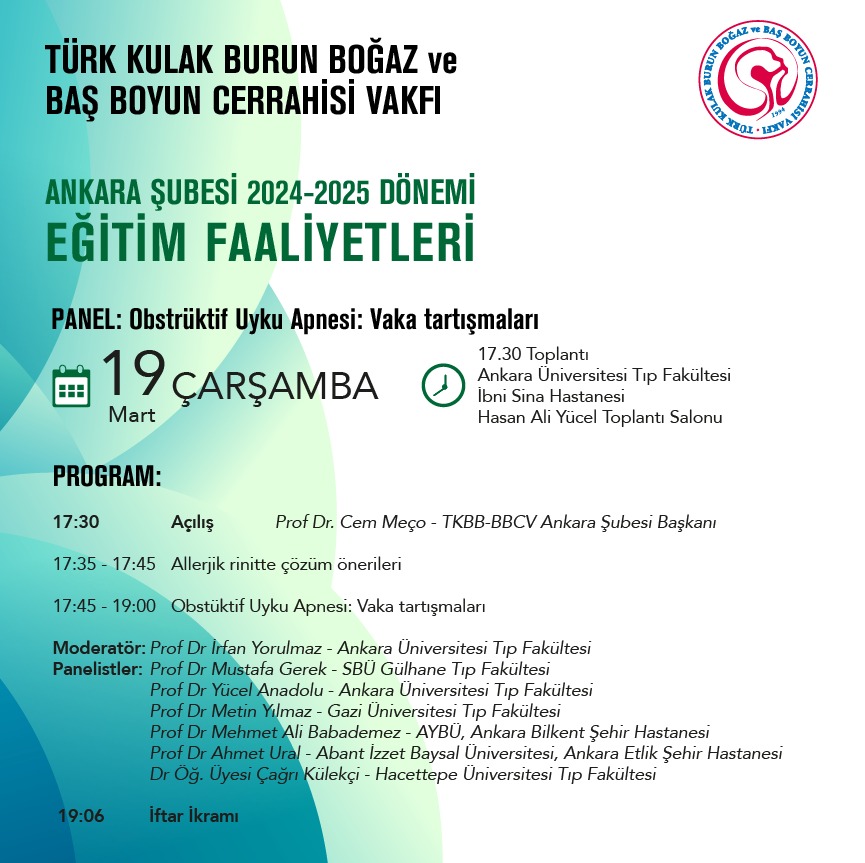 Türk Kulak Burun Boğaz ve Baş Boyun Cerrahisi Vakfı Ankara Şubesi 2024-2025 Eğitim Faaliyetleri: 19 Mart 2025