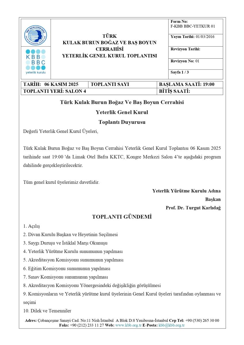 Türk KBB BBC Derneği Yeterlik Kurulu Olağan Genel Kurul Toplantı Duyurusu