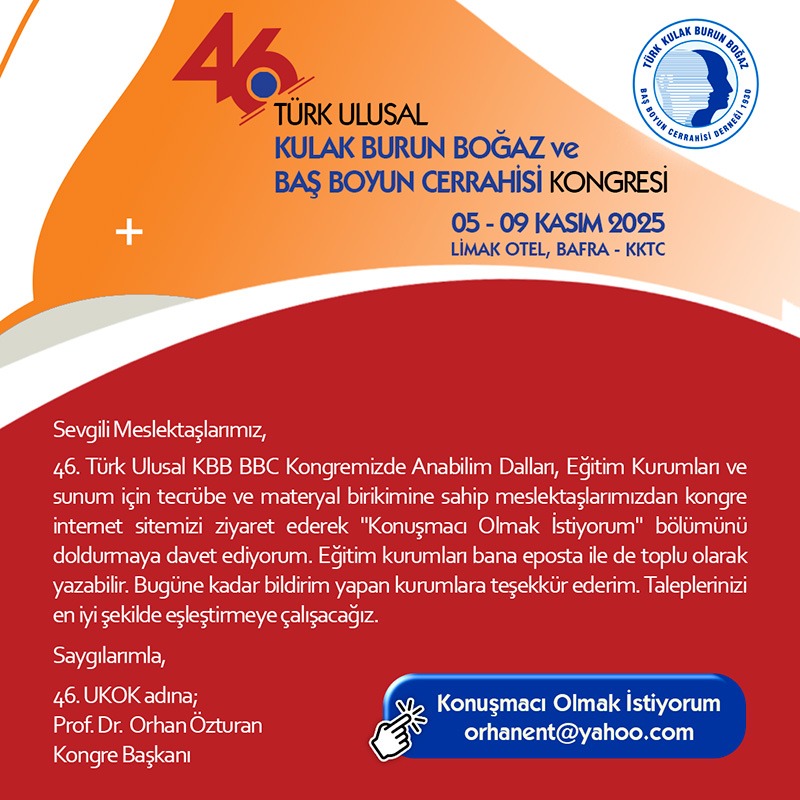 46. Türk Ulusal Kulak Burun Boğaz ve Baş Boyun Cerrahisi Kongresi Konuşmacılarını Arıyor, Son Çağrı !