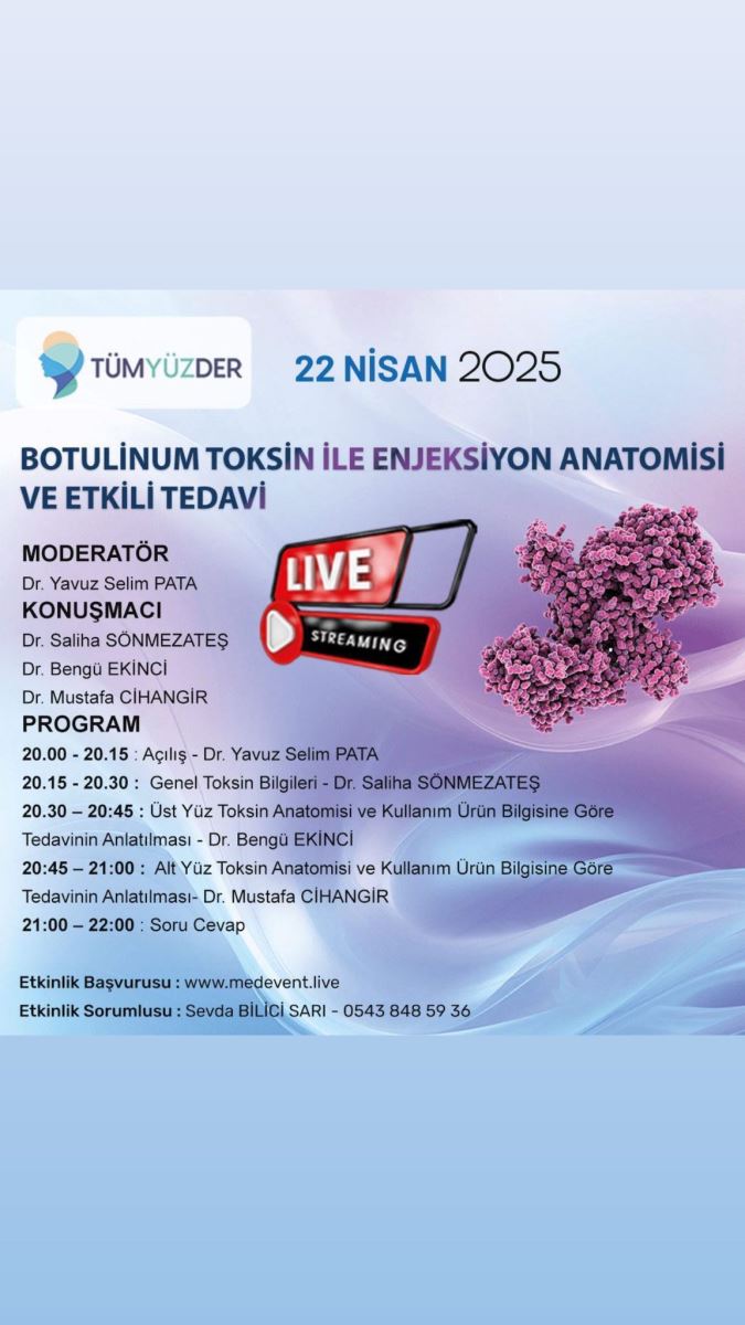 🎓 Akademik düzeyde hazırlanmış bu program, botulinum toksin uygulamalarında güvenlik, etkinlik ve hasta memnuniyeti odaklı kavramları bir arada sunuyor. Teorik bilgilerin yanı sıra, klinik örnekler ve interaktif Q&A bölümü ile her seviyeden hekimi destekleyecek içerikler sizlerle.