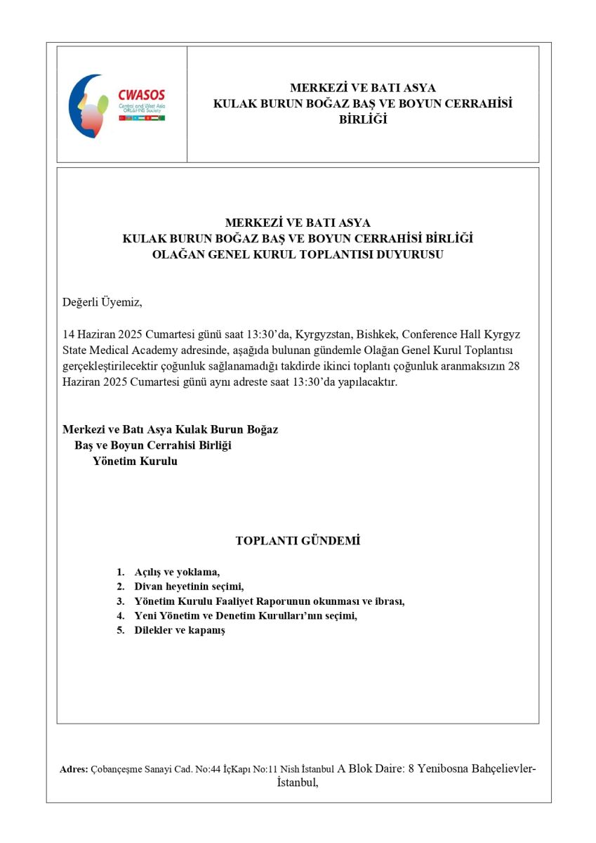 Merkezi Ve Batı Asya Kulak Burun Boğaz Baş Ve Boyun Cerrahisi Birliği Olağan Genel Kurul Toplantısı Duyurusu