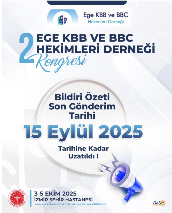 3–5 Ekim 2025 tarihleri arasında İzmir'de gerçekleşecek olan 2. Ege KBB ve BBC Hekimleri Derneği Kongresinin bildiri özeti gönderim süresi 15 Eylül 2025 tarihine kadar uzatılmıştır.