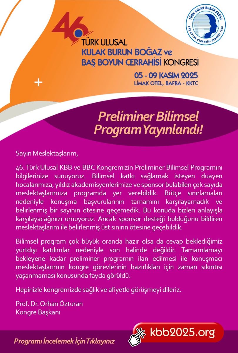 46. Türk Ulusal Kulak Burun Boğaz ve Baş Boyun Cerrahisi Kongresi Preliminer Bilimsel Program Yayınlandı!
