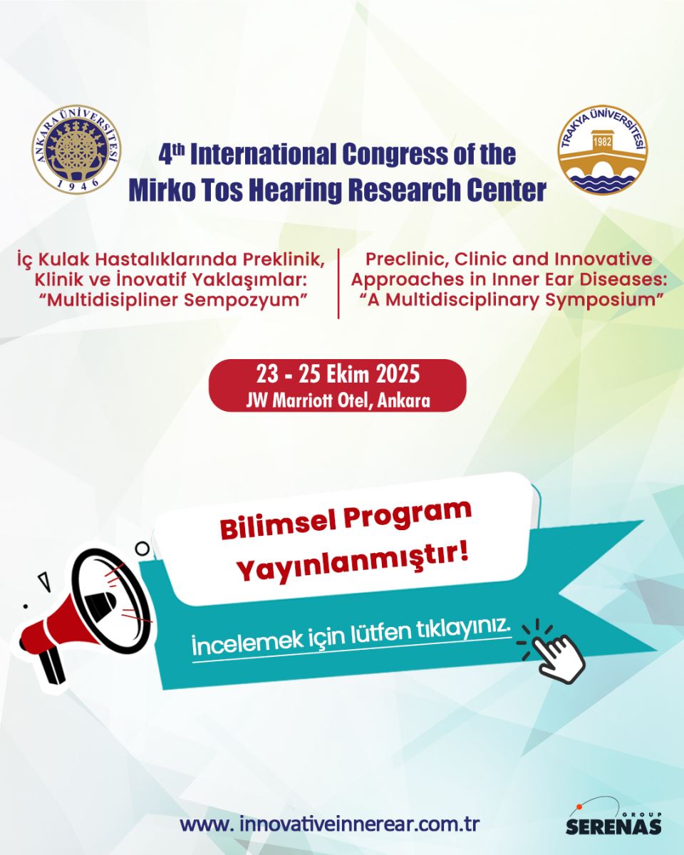 4th International Congress of the Mirko Tos Hearing Research Center kapsamında düzenlenecek “İç Kulak Hastalıklarında Preklinik, Klinik ve İnovatif Yaklaşımlar: Multidisipliner Sempozyumu” 23 – 25 Ekim 2025 tarihlerinde JW Marriott Otel Kongre Merkezi, Ankara’da düzenlenecektir.