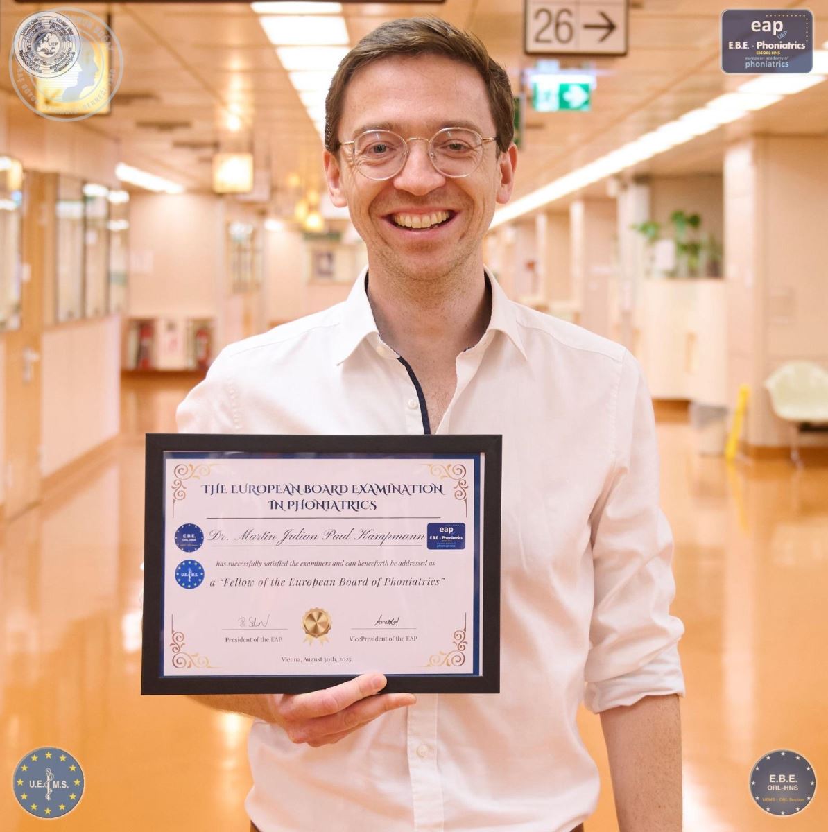 The Board of the European Academy of Phoniatrics (EAP) and the Union of European Phoniatricians (UEP) proudly announce their first fellows: Dr. Martin Kampmann (Germany) and Dr. Silvia Capobianco (Italy). Congratulations to both!