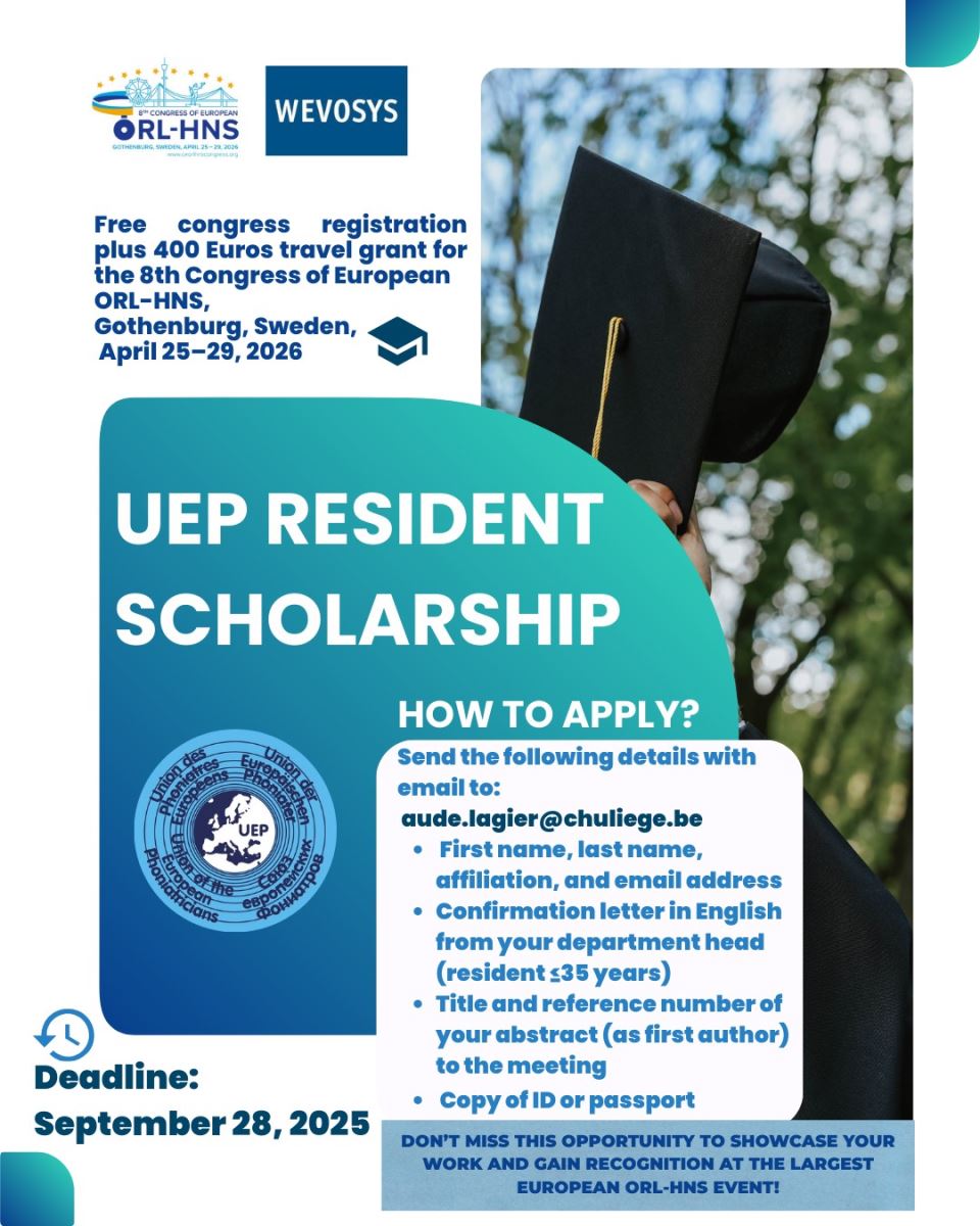 • Free congress registration plus 400 Euros travel grant for the 8th Congress of European ORL-HNS, Gothenburg, Sweden, April 25–29, 2026