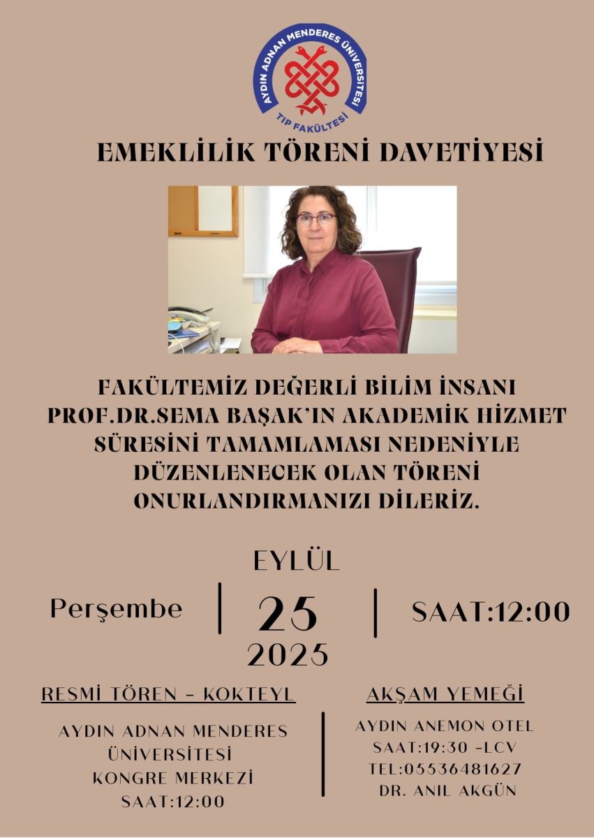 Prof. Dr.Sema Başak'ın emekliliği nedeniyle düzenlenecek resmi tören ve kokteyl, 25 Eylül 2025 Perşembe günü, saat 12.00'da ADÜ Kongre Kültür Merkezinde düzenlenecektir. Katılımınız bizleri mutlu edecektir.