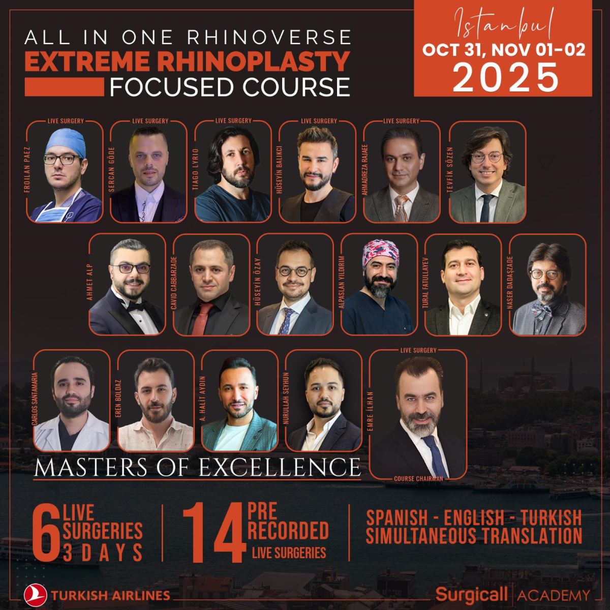 31 Ekim- 2 Kasım 2025 tarihlerinde ALL IN ONE RHINOVERSE EXTREME RHINOPLASTY FOCUSED COURSE 2025 Toplantısına 35 yaş altı uzman meslektaşlarımıza ücretsiz 5 kişi için kayıt desteği verilecektir.