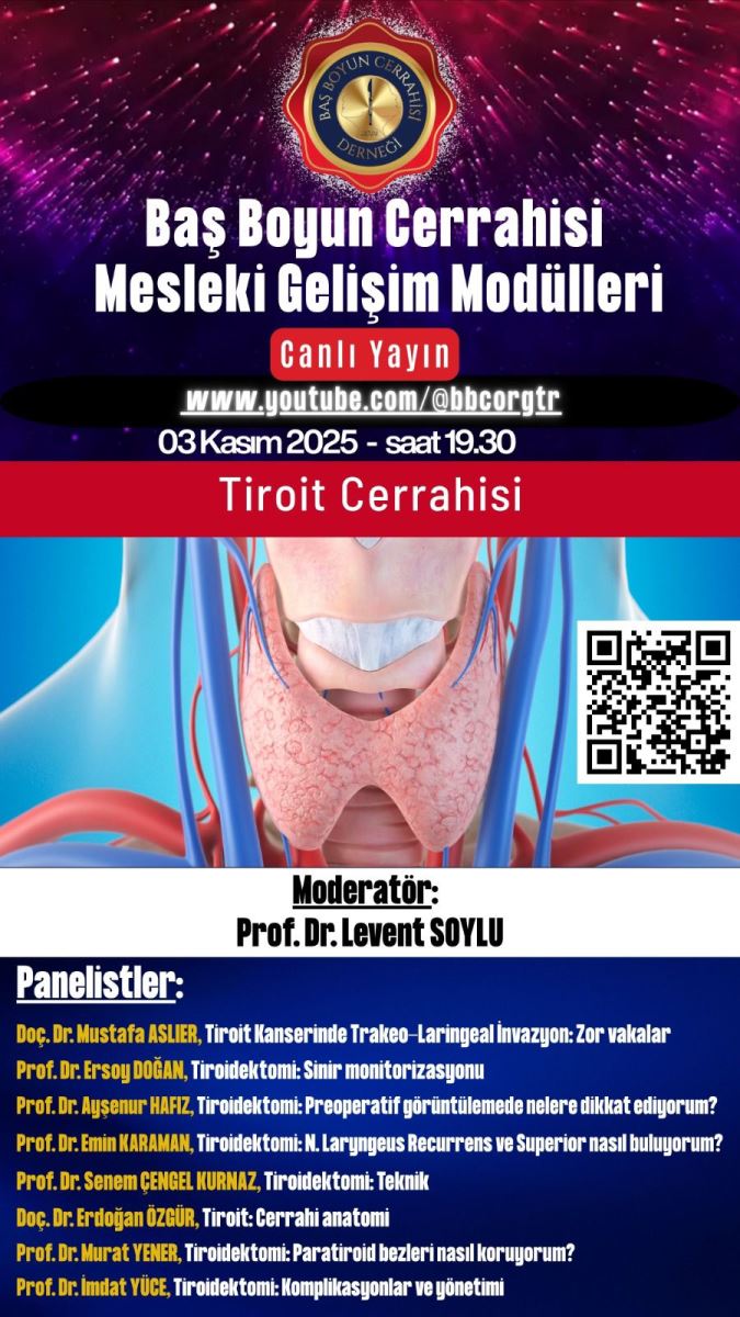Baş Boyun Cerrahisi Derneğinin "Mesleki Gelişim Modülleri" kapsamında 03 Kasım 2025, pazartesi günü saat 19.30 da yapılacak olan "Tiroit cerrahisi" paneline ilgilenen tüm meslektaşlarımızı davet ederiz.