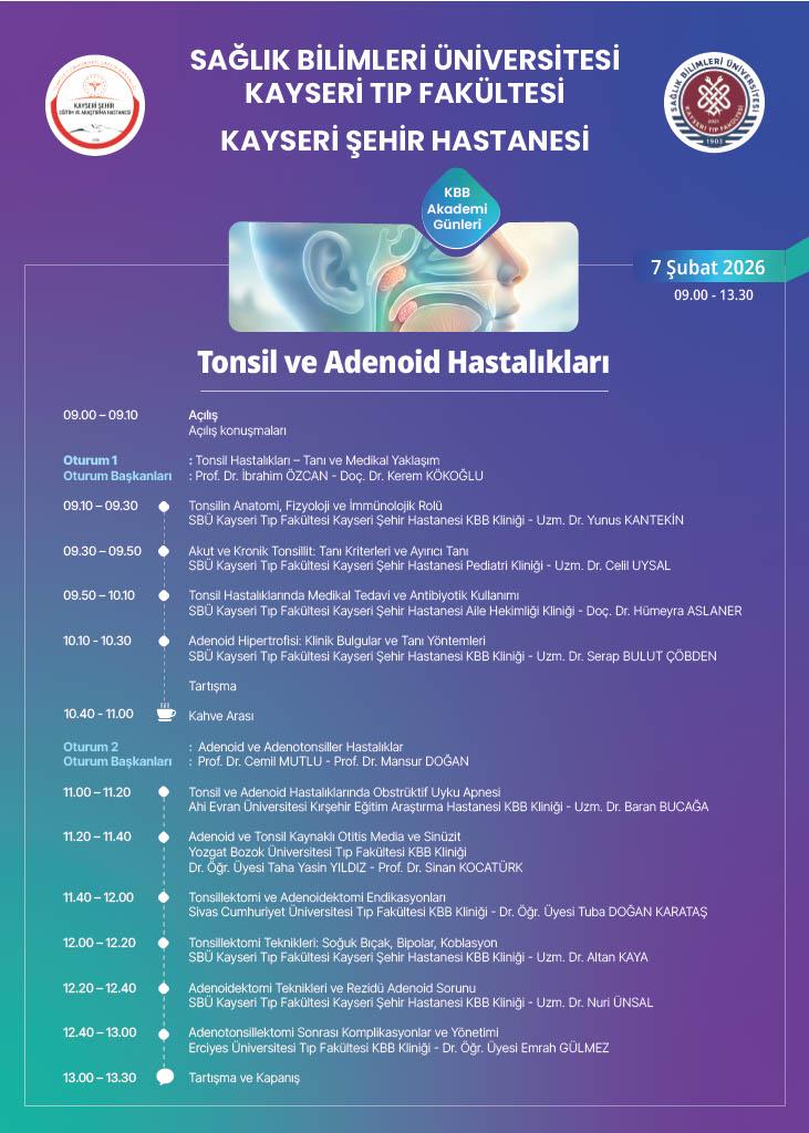 Sağlık Bilimleri Üniversitesi Kayseri Tıp Fakültesi Kayseri Şehir Hastanesi " Tonsil ve Adenoid Hastalıkları" : 7 Şubat 2026