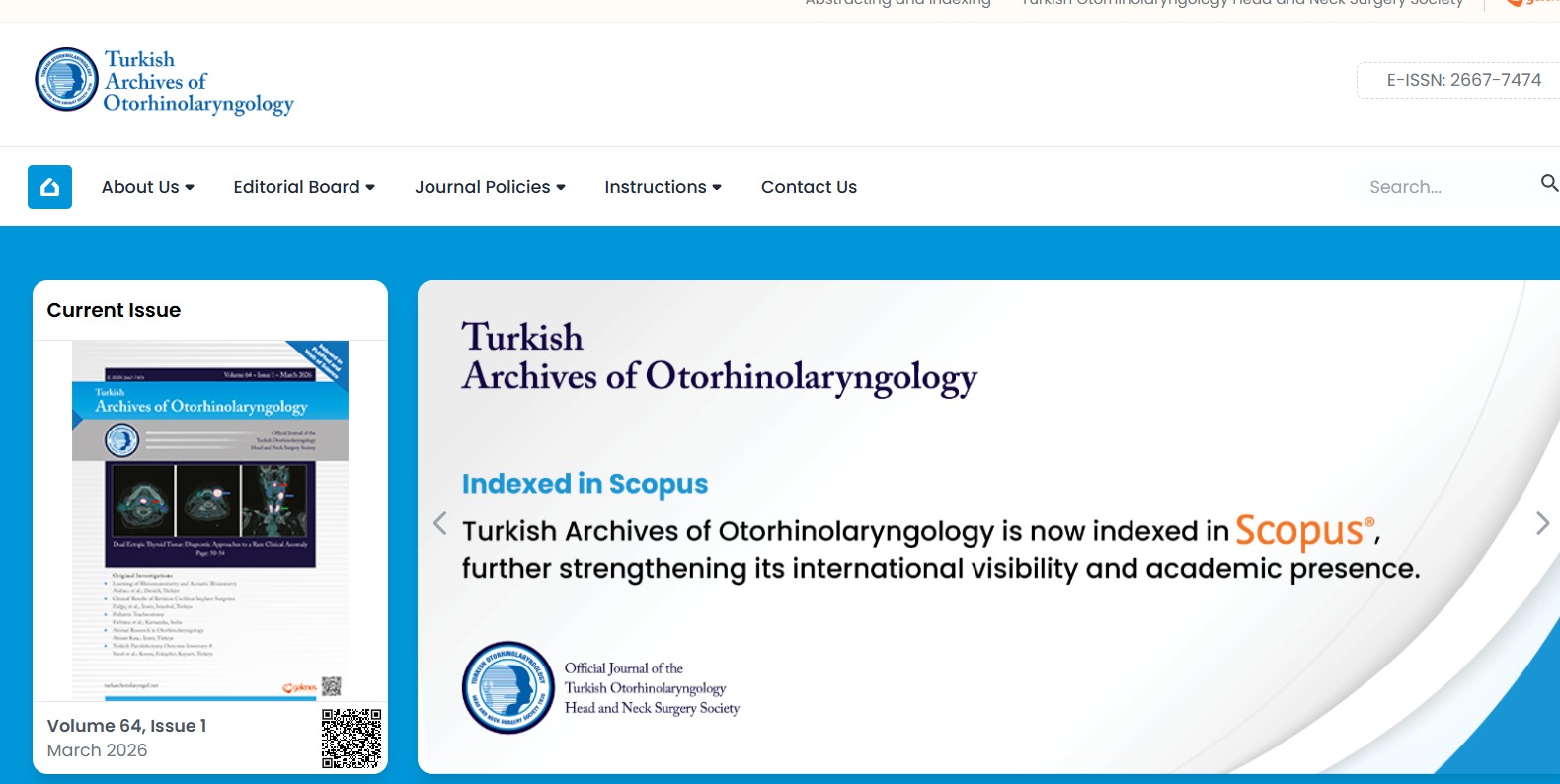 Dergimiz Turkish Archives of Otorhinolaryngology’nin Scopus dizinine kabul edilmesi, dergimizin uluslararası görünürlüğünü ve bilimsel etki potansiyelini önemli ölçüde artıracaktır. Bu gelişmenin, camiamızdan ve dünyadan daha nitelikli ve yüksek etkili çalışmaların dergimize yönelmesine katkı sağlayacağına inanıyoruz. Türk KBB camaisı olarak, daha güçlü bir bilimsel platform oluşturma yolunda önemli bir adım atılmasının gurur ve sevincini yaşıyoruz.