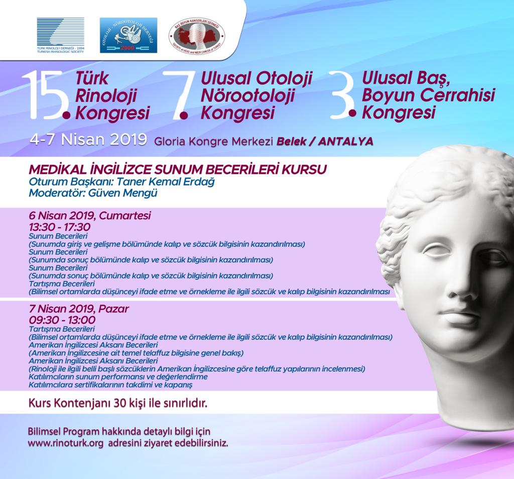 15. Türk Rinoloji, 7. Ulusal Otoloji Nörootoloji, 3. Ulusal Baş Boyun Cerrahisi Kongresi Medikal İngilizce Sunum Becerileri Kursu