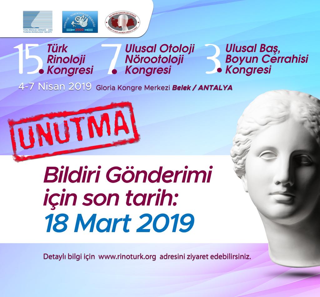 15.Türk Rinoloji, 7.Ulusal Otoloji-Nörootoloji, 3.Ulusal Baş Boyun Cerrahisi Kongresi Bildirileri Gönderimi için Son Tarih: 18 Mart 2019