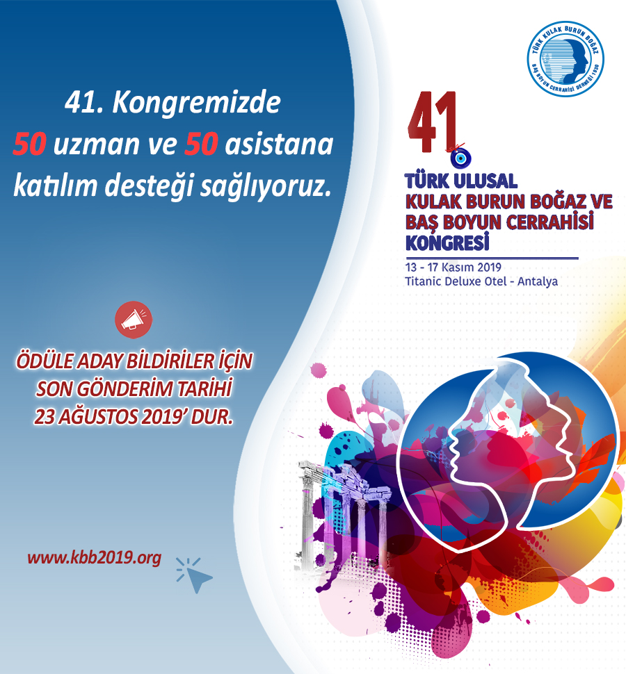 41. Ulusal Türk Kulak Burun Boğaz ve Baş Boyun Cerrahisi Kongresine “Ödüle Aday Bildiriler için Son Gönderim 23 Ağustos 2019”