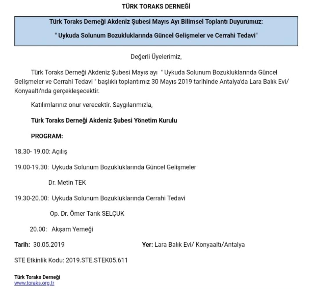 30 Mayıs Perşembe Akşamı Antalya'da Türk Toraks Derneği Akdeniz Şubesi Toplantısında 'Uykuda Solunum Bozukluklarında Cerrahi Tedavi' konusu SBÜ Antalya SUAM KBB Kliniği Eğitim Görevlisi Doç.Dr.Ömer Tarık Selçuk tarafından anlatılacaktır.