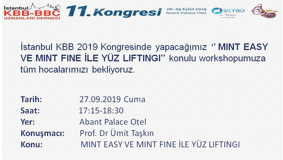 26 - 29 Eylül 2019 tarihleri arasında Abant Palace Otel de yapılacak olan İstanbul KBB Uzmanları Derneği 11. Kongresinde “İple yüz Germe, Kaş Kaldırma” (workshop) yapılacaktır.