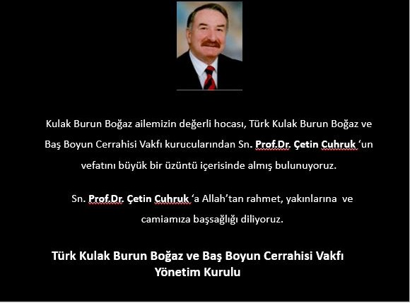Sayın Prof Dr Çetin Çuhruk hocaya Allahtan rahmet, Türk KBB-BBC Topluluğu, Ankara Tıp KBB, sevenleri ve ailesine de sabır ve başsağlığı diliyorum