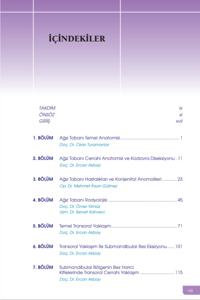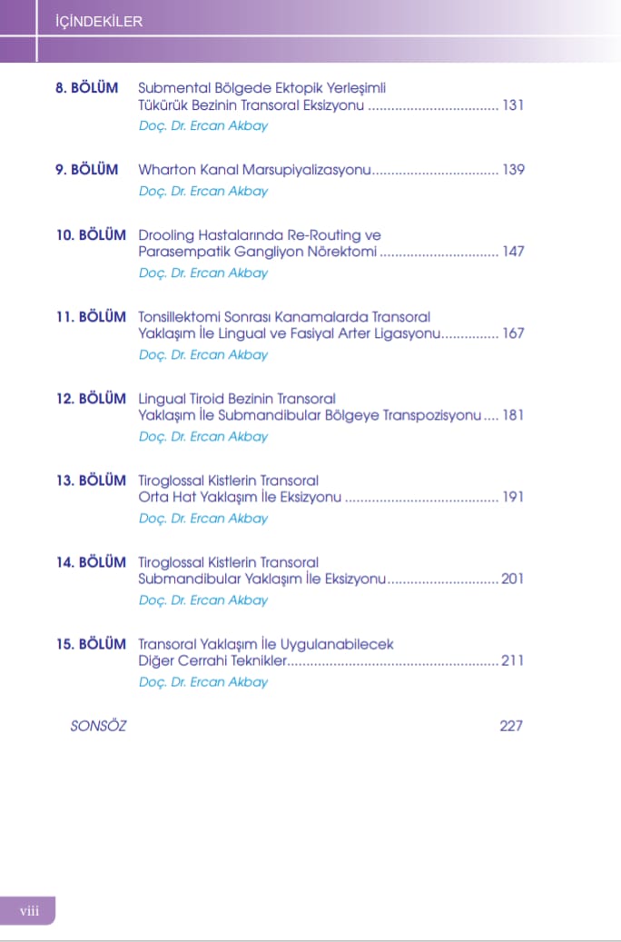Akademisyen Yayınevi tarafından basılmış olan bu kitap, ilgili alanda önemli bir kaynak açığını kapatmaktadır. Yaklaşık 250 sayfa renkli kuşe kağıda basılmış olan kitap içerisinde 15 konu başlığı bulunmaktadır. 153 adet renkli resim ve çizimler kullanılarak cerrahi teknikler aşama aşama gösterilmiştir. Bir kısmını daha önceden makale olarak basılmış, son günlerde duymuş olabileceğiniz konular oluşturmaktadır. Kitabın diğer yarısı ise ilk defa duyacağınız cerrahi tekniklerden oluşmaktadır. Dünya tıp literatüründe bu anatomik sahanın transoral yaklaşımları konusunda bu kadar detaylı bir kitap henüz mevcut değildir. Ekte kitapta yer alan konulardan 2 örnek PDF olarak mevcuttur. Ayrıca kitap arkasında yer alan karekod ile giriş yapıldığında ilgili operasyonlara ait videolar izlenebilmektedir. Kitabı tüm KBB hekimlerinin hizmetine sunmaktan gurur duyarız.