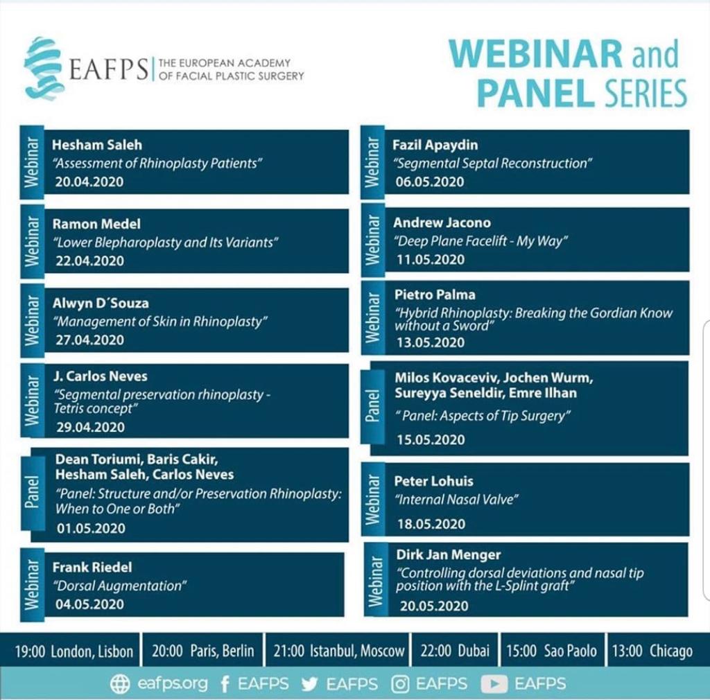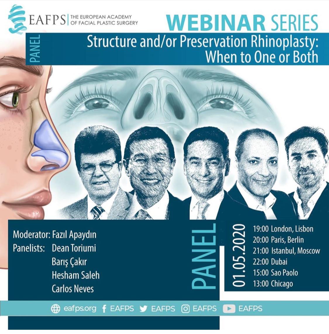 Son günlerde Yüz Plastik Cerrahi alanında düzenlenen Webinar’larda ülkemizi Prof. Dr. Fazıl Apaydın, Doç. Dr. Eren Taştan, Op. Dr. Abdulkadir Göksel, Op. Dr. Emre İlhan davetli konuşmacı olarak başarı ile temsil ettiler. Avrupa Yüz Plastik Cerrahi Akademisinin düzenlediği webinarlarda ilerleyen günlerde de çeşitli meslektaşlarımız ülkemizi temsil etmeye devam edecektir.