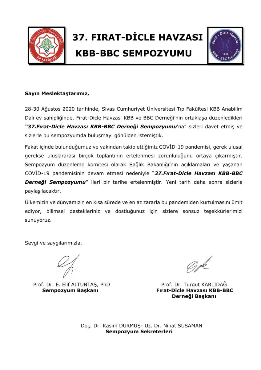 37.Fırat-Dicle Havzası KBB-BBC Derneği Sempozyumu Ertelendi
