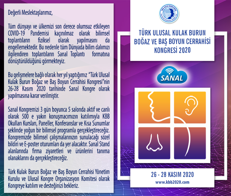 Türk Ulusal KBB ve BBC Kongresi 2020 Sanal Kongre Olarak Gerçekleştirilecek