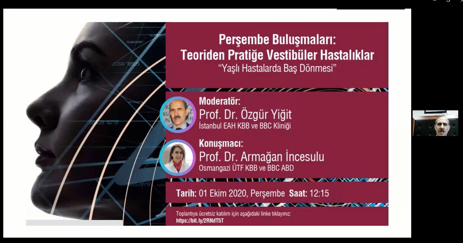 Teoriden pratiğe vestibüler hastalıklar Perşembe toplantısı Prof.Dr.Özgür Yiğit moderatörlüğünde gerçekleştirildi.Prof.Dr. Armağan İncesulu’nun konuşmacı olarak görev aldığı toplantıda Yaşlı Hastalarda Baş dönmesi ile ilgili değerli bilgiler paylaşıldı.Toplantıya çok sayıda meslektaşımız zoom üzerinden katılma imkanı buldu.