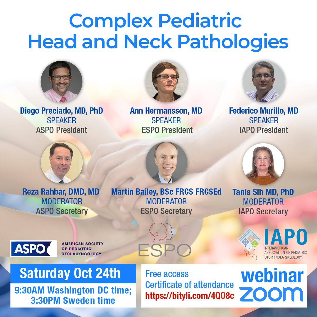 As you may know a joint webinar by ASPO, ESPO & IAPO on Complex Pediatric Head and Neck Pathologies is being organised for this Saturday (24th October at 3.30 PM CEST). Details attached and you could register free of charge through this link ( https://www.iapo.org.br/scc/cursos/eventos_detalhes.asp?cod=98&idioma=ingles )