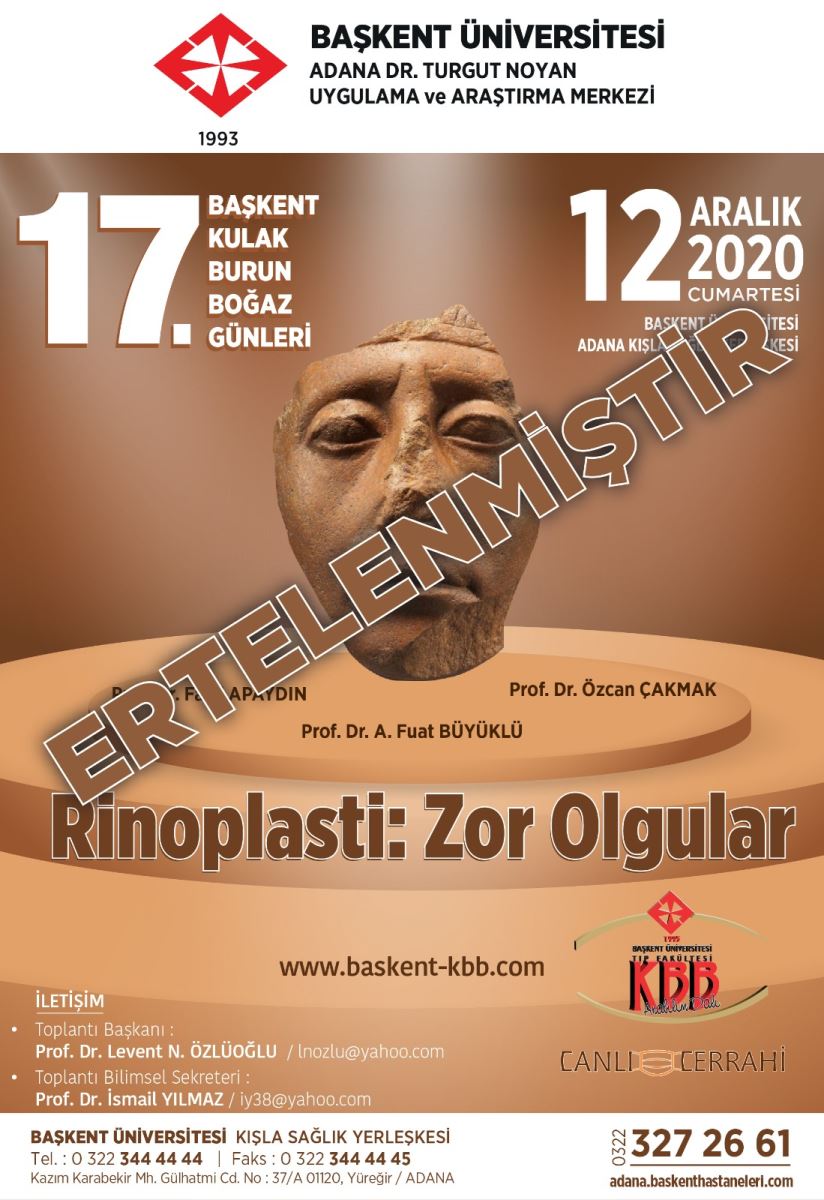 12 Aralık 2020'de gerçekleştirmeyi planladığımız 17. Başkent KBB Günleri 'Rinoplasti: Zor Olgular' adlı toplantımız, Covid-19 önlemleri çerçevesinde ileri bir tarihe ertelenmiştir. Toplantı ile ilgili yeni bilgiler önümüzdeki dönemde sizlerle paylaşılacaktır.
