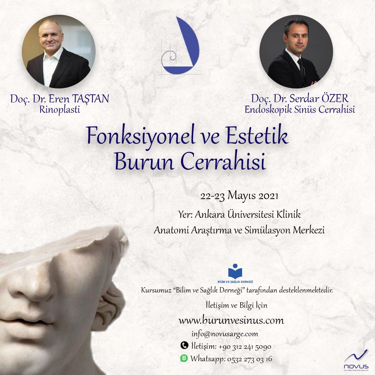 T.C. Sağlık Bakanlığı'nın COVID-19 hastalığı mücadelesi kapsamında yayınlamış olduğu kurallar çerçevesinde; 22-23 MAYIS 2021 tarihinde Ankara Üniversitesi Klinik Anatomi Araştırma ve Simülasyon Merkezi’nde, Doç. Dr. Eren TAŞTAN ve Doç. Dr. Serdar ÖZER tarafından sosyal mesafeli olarak gerçekleştirilecek ‘’Fonksiyonel ve Estetik Burun Cerrahisi’’ konulu kadavra kursumuza siz değerli hekimlerimizin katılımlarını beklemekteyiz. Katılım KONTENJAN ile sınırlıdır.