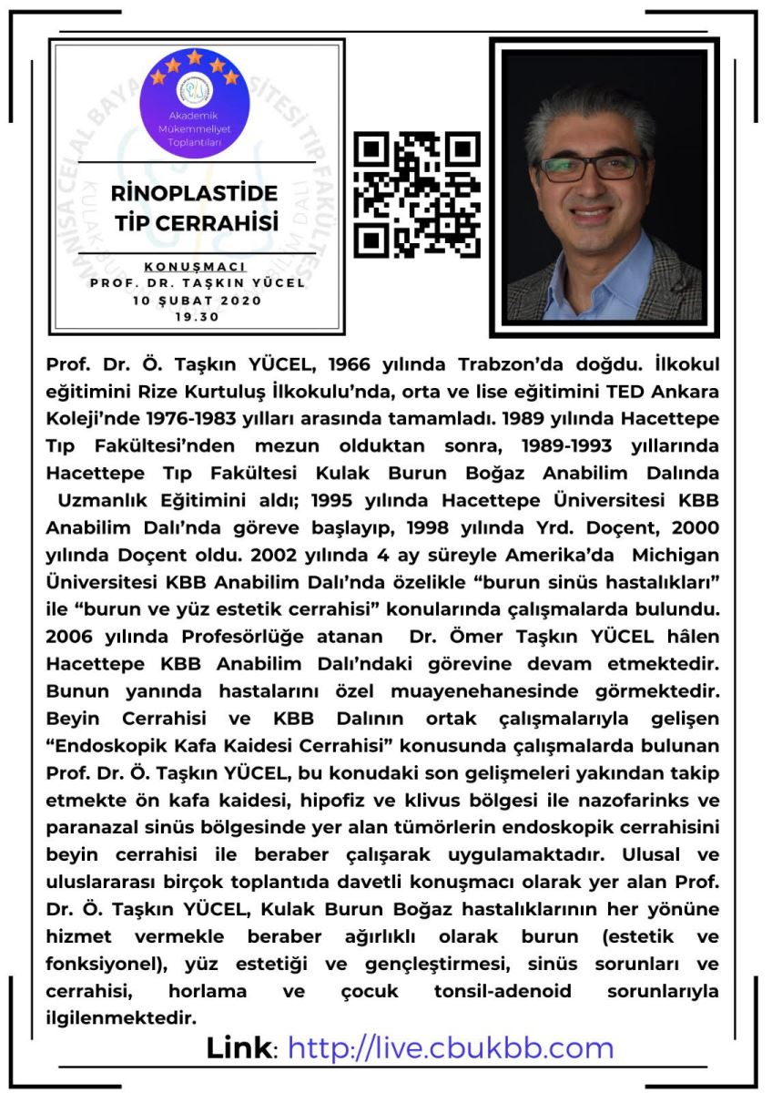 Manisa Celal Bayar Üniversitesi Kulak Burun Boğaz Hastalıkları Anabilim Dalı'nın düzenlediği Akademik Mükemmeliyet Toplantıları'nda siz değerli meslektaşlarımızı da aramızda görmekten onur duyarız.