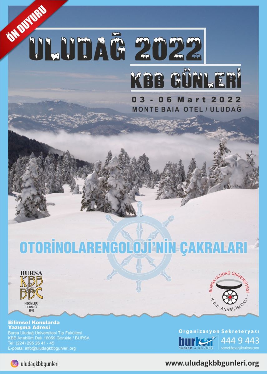 Bursa Uludağ Üniversitesi KBB Anabilimdalı ve Bursa KBB&BBC Hekimleri derneğinin ortaklaşa düzenlediği Uludağ KBB Günleri 2022 kongresinin tarihleri belli oldu. Branşımızın tek kış kongresinde siz değerli meslektaşlarımızla tekrar birlikte olmayı heyecanla bekliyoruz.