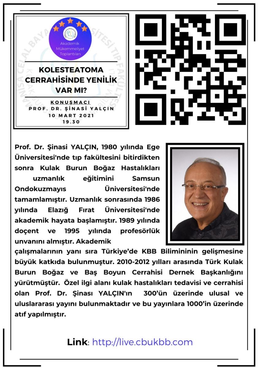 Manisa Celal Bayar Üniversitesi Kulak Burun Boğaz Hastalıkları Anabilim Dalı'nın düzenlediği Akademik Mükemmeliyet Toplantıları'nda siz değerli meslektaşlarımızı da aramızda görmekten onur duyarız.