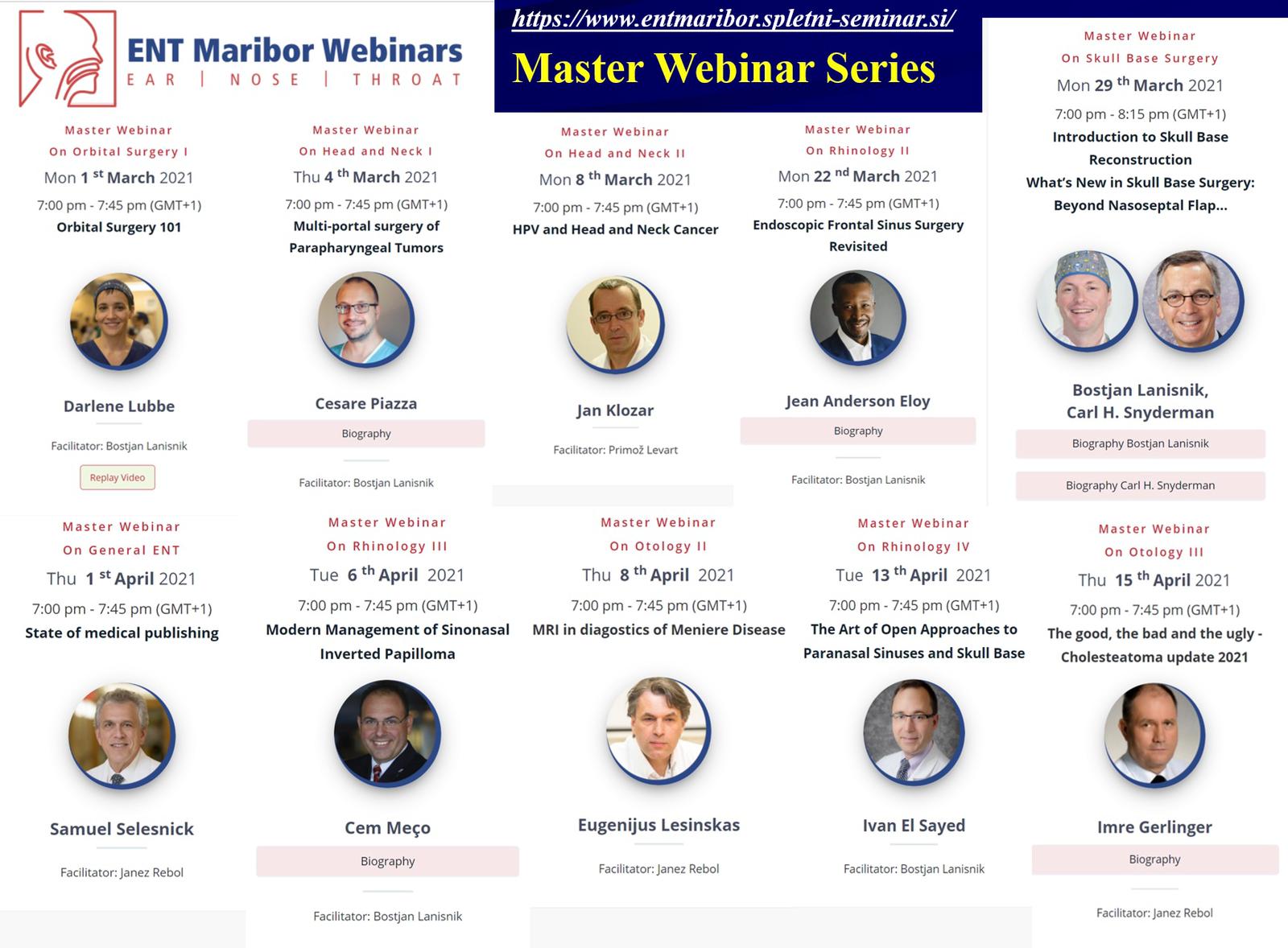 Ülkemizden Prof. Dr. Cem Meço’nun da “Modern Management of Sinonasal Inverted Papilloma” başlıklı sunumu ile 6 Nisan Salı günü katılacağı seminerler serisi ücretsiz olup kayıt için aşağıdaki linke tıklayabilirsiniz. ENT Maribor Webinar’larının detaylı programı görselde yer almaktadır.