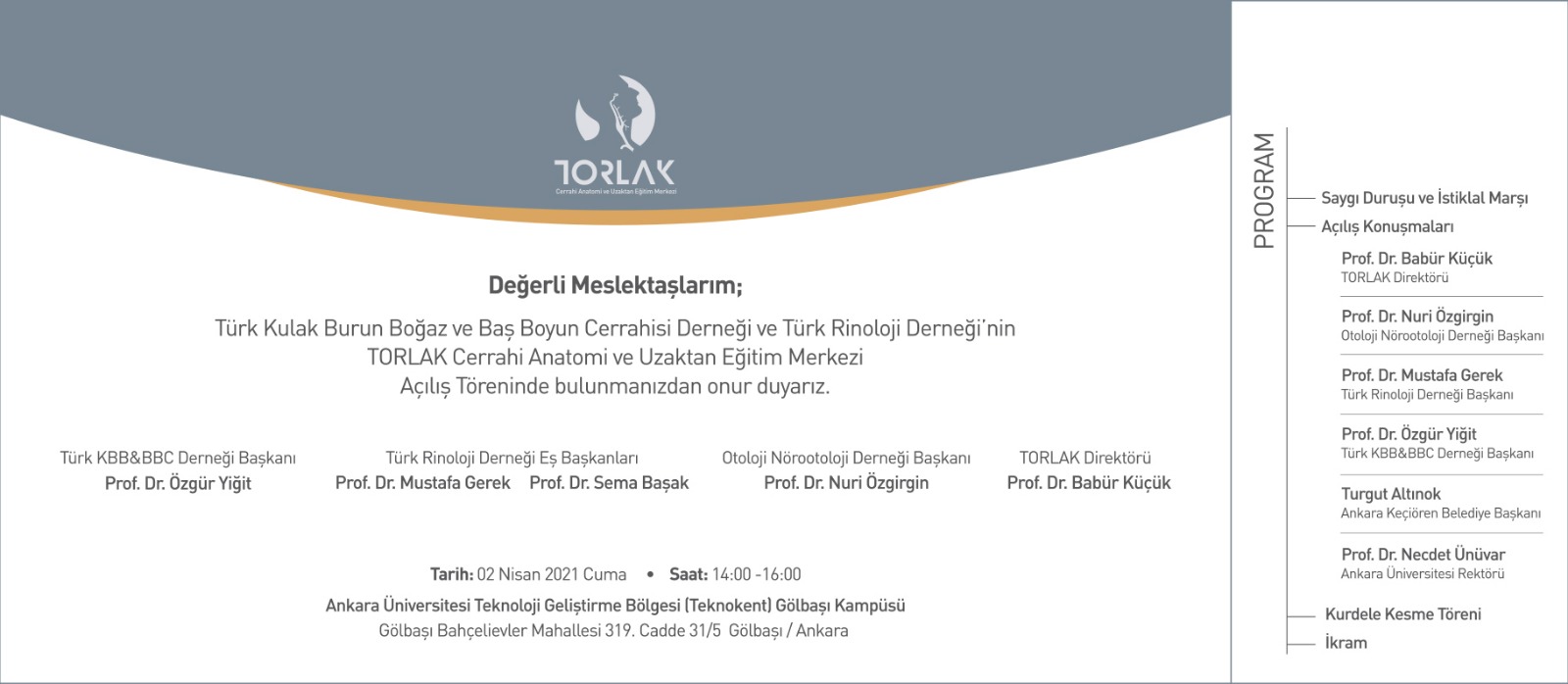 Türk Oto Rino Larengoloji Akademisi (TORLAK) Cerrahi Anatomi ve Uzaktan Eğitim Merkezi, Ankara Teknokent’te 02 Nisan 2021’de açılıyor. TORLAK, Türk Rinoloji Derneği ve Türk Kulak Burun Boğaz ve Baş Boyun Cerrahisi Derneği (Türk KBB BBC Derneği) yatırım ortaklığı ve Ankara Üniversitesi işbirliği ile hazırlanmış bir Teknokent Ar-Ge projesidir. Otoloji Nörootoloji Derneği ortaklar arasına katılma aşamasındadır.