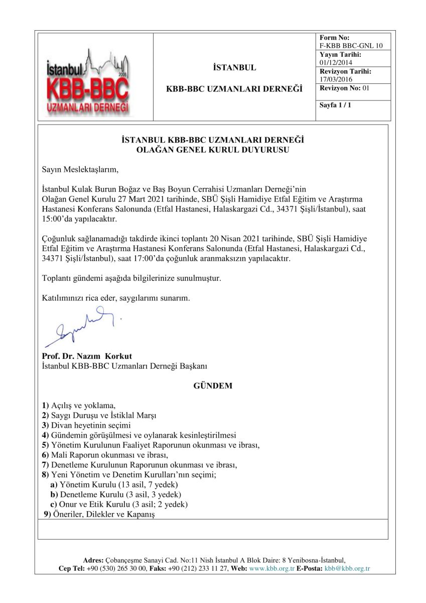 İstanbul Kulak Burun Boğaz ve Baş Boyun Cerrahisi Uzmanları Derneği’nin Olağan Genel Kurul Toplantısı 17 Nisan 2021 Cumartesi günü sokağa çıkma yasağı ve İç İşleri Bakanlığının 02.03.2021 tarih ve 3514 sayılı Genelgesi doğrultusunda 20 Nisan 2021 Salı günü saat 17:00’da gerçekleştirilecektir.