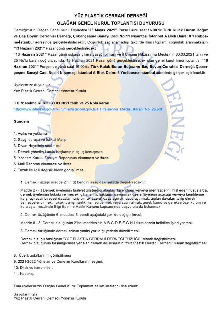 Yüz Plastik Cerrahi Derneği Olağan Genel Kurul Toplantısı Duyurusu