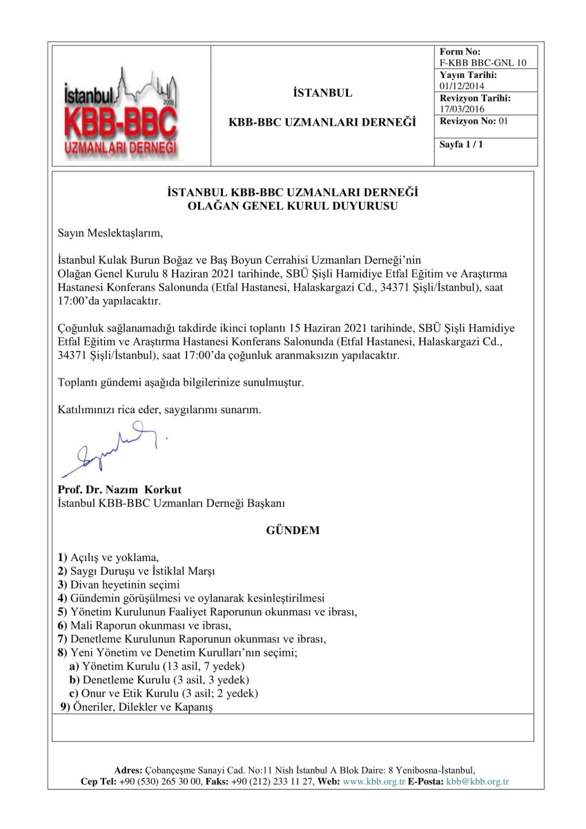 İSTANBUL KBB BBC UZMANLARI DERNEĞİ OLAĞAN GENEL KURUL TOPLANTI DUYURUSU
