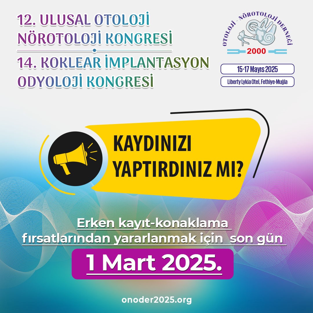 12. Ulusal Otoloji Nörotoloji Kongresi, 14. Koklear İmplantasyon Odyoloji Kongresi Kaydınızı Yaptırdınız mı ?: 15-17 Mayıs 2025