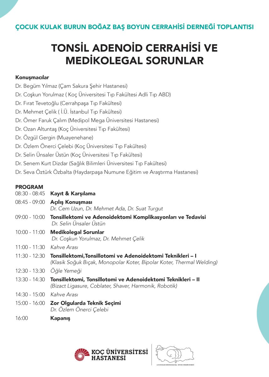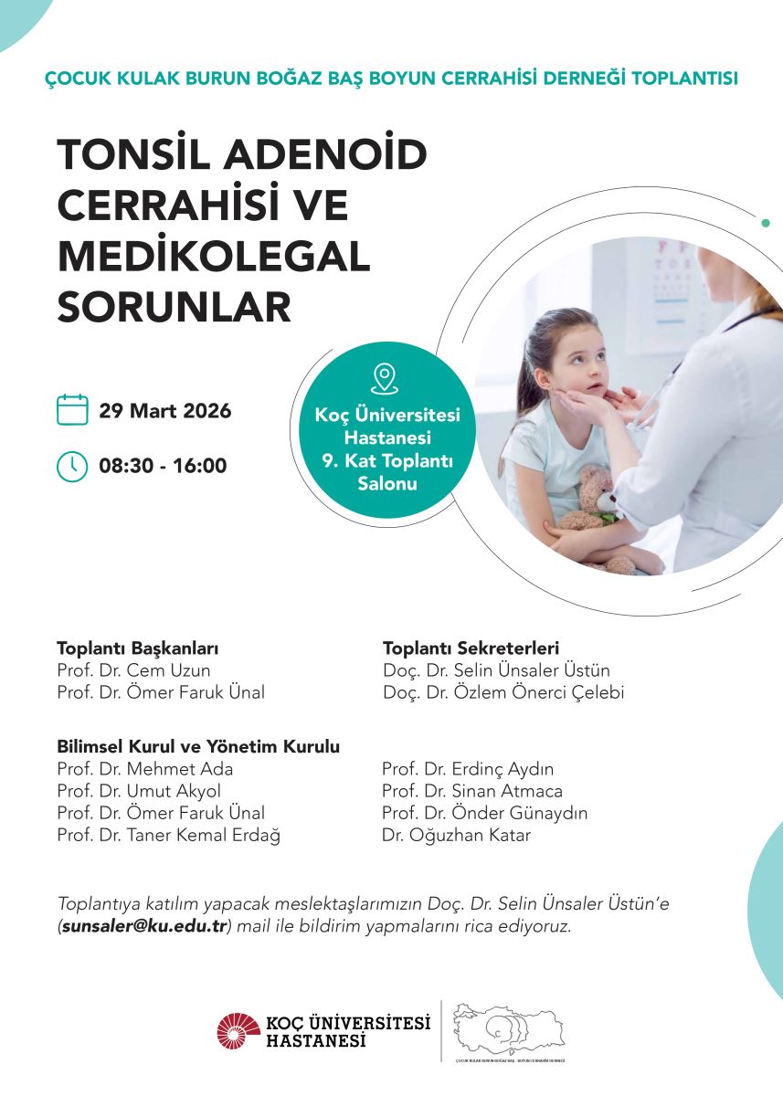 Çocuk Kulak Burun Boğaz ve Baş Boyun Cerrahisi derneği olarak 29 Mart 2026 Pazar günü Koç Üniversitesi Tıp Fakültesi Topkapı yerleşkesinde "Tonsil Adenoid Hastalıkları Cerrahisi ve Medikolegal Sorunlar’’ konulu bir toplantı düzenlenecektir. Prof.Dr.Cem Uzun ve Prof.Dr.Ömer Faruk ÜNAL hocalarımız bizi misafir edecek. Çok teşekkür ediyoruz. Konumuz güncel bir konu özellikle genç arkadaşlarımın tecrübeli hocaları ile birlikte geniş katılımını bekliyoruz. Toplantımıza Koç Üniversitesi Tıp Fakültesi Adli Tıp ABD Başkanı Prof.Dr.Çoşkun Yorulmaz katılacak. Ayrıca Prof Dr.Mehmet Çelik hocamız da Medikolegal sorunlara KBB ci olarak katkıda bulunacak. Hepimizin ulaşabileceği teorik bilgilerden ziyade cerrahi teknikleri, özelliklerini, deneyimleri, Medikolegal sorunları içeren interaktif bir toplantı olması arzusundayız.Toplantı salonumuzun kısıtlı olması nedeniyle katılacak meslektaşlarımın lütfen Doç.Dr.Selin Ünsaler Üstün’e mail atmasını rica ediyoruz.